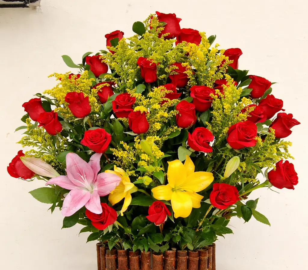 Está compuesto por una gran cantidad de rosas rojas, símbolo universal del amor y la pasión, acompañadas de lirios en tonos amarillo y rosado, que aportan un toque de sofisticación y delicadeza. Se complementa con flores de relleno amarillas (solidago) que brindan textura, volumen y un contraste luminoso, junto con un follaje verde fresco que realza toda la composición.